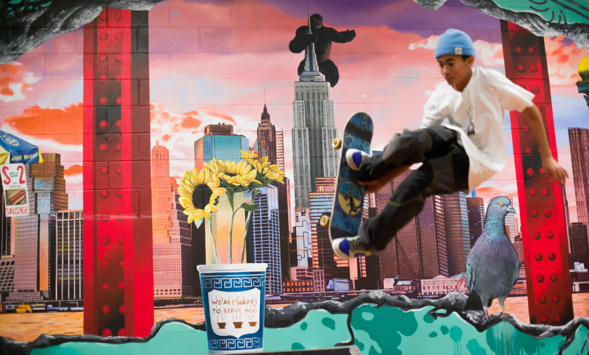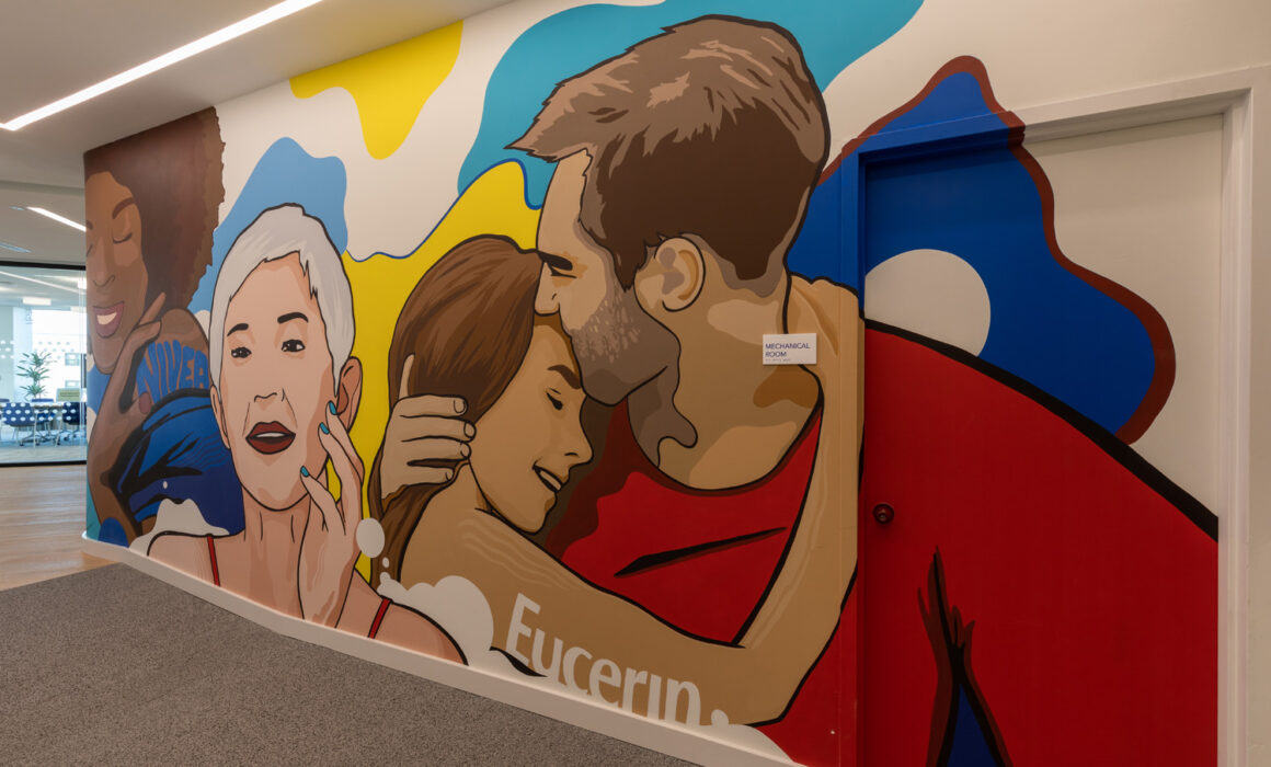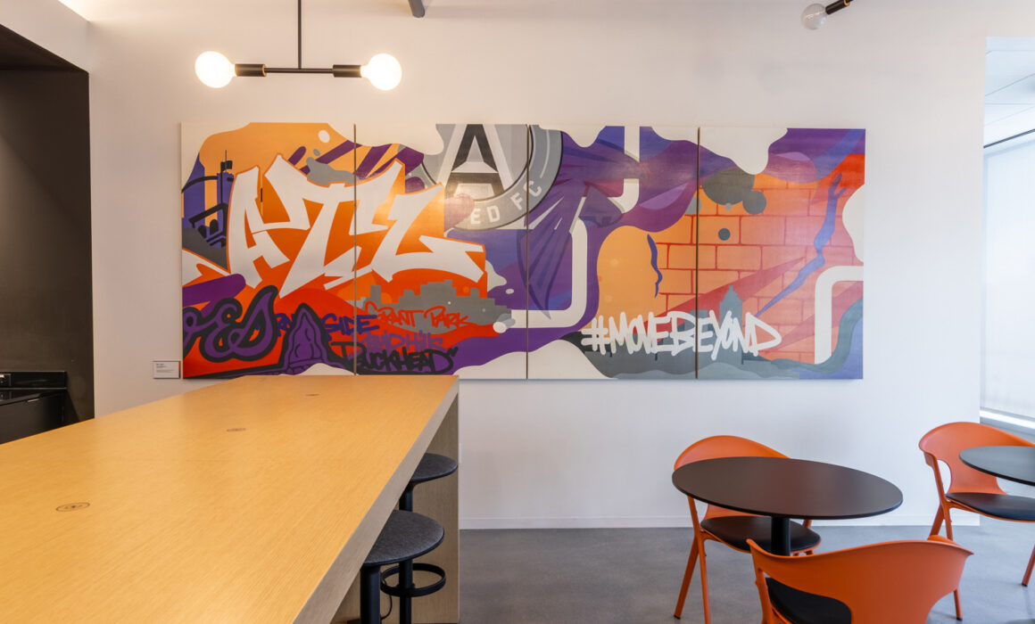 The Houston office of Global architecture firm Gensler came to MAC with a project for elevator company TKE’s new Atlanta HQ. Housed in a tall building, the location serves as the new offices and elevator testing / development site for TKE. Employees moved to ATL from all over the country and world to work in this facility. Gensler wanted to represent different elements of Atlanta culture via art in different spaces on various floors. Our remote creative team and Atlanta based team member brainstormed a few recognizable icons and Atlanta touchstones for the layout and stayed pretty true to TKE’s branded palette. MAC artists painted on plywood panels off site and later installed with z clips in the pre designated area. The fasteners were used so that the panels can be taken down, sold or donated and new art cycled in.