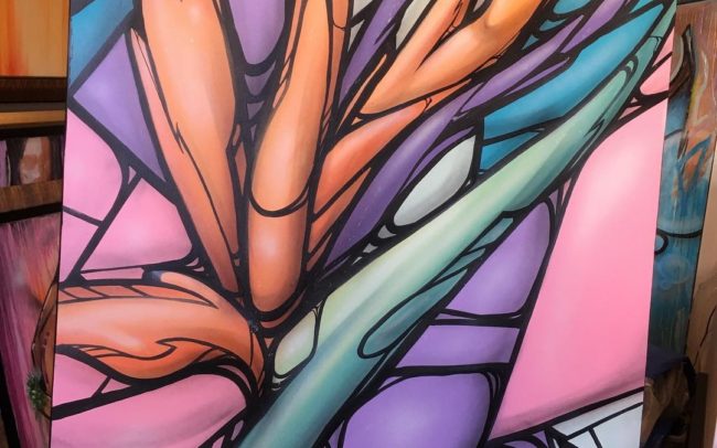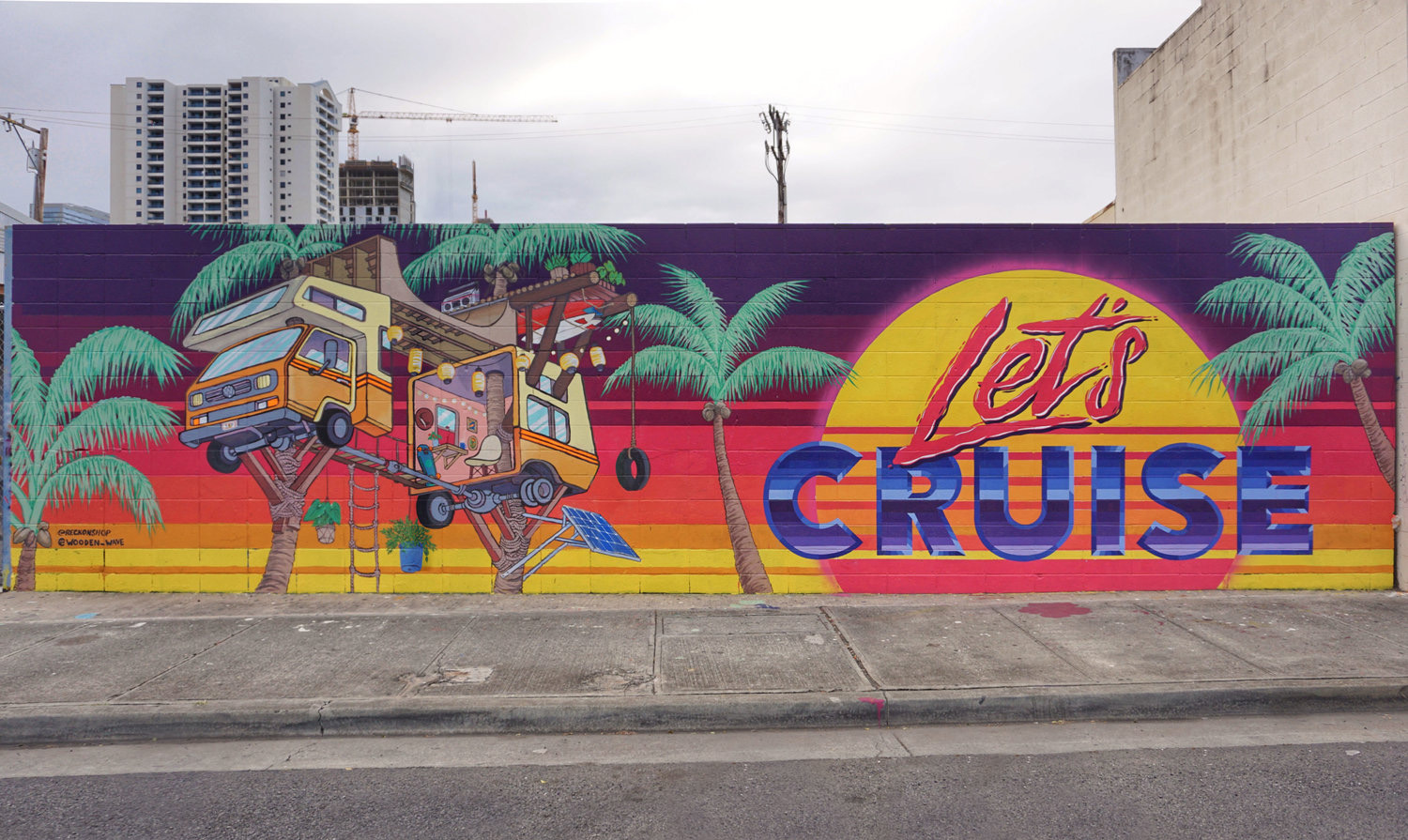 In addition to Hawaii, they have painted murals in California, Nevada, and Washington, DC. Wooden Wave also specializes in illustration and design, having done logos and apparel images for a variety of clients including comedian George Lopez and boxer Floyd Mayweather. In the spring of 2016 they released a capsule collection of shoe designs for the footwear company Olukai. Together they have exhibited their fine art paintings in Hawaii and abroad, with their most recent exhibition at the Smithsonian Arts and Industries Museum in Washington, DC.
