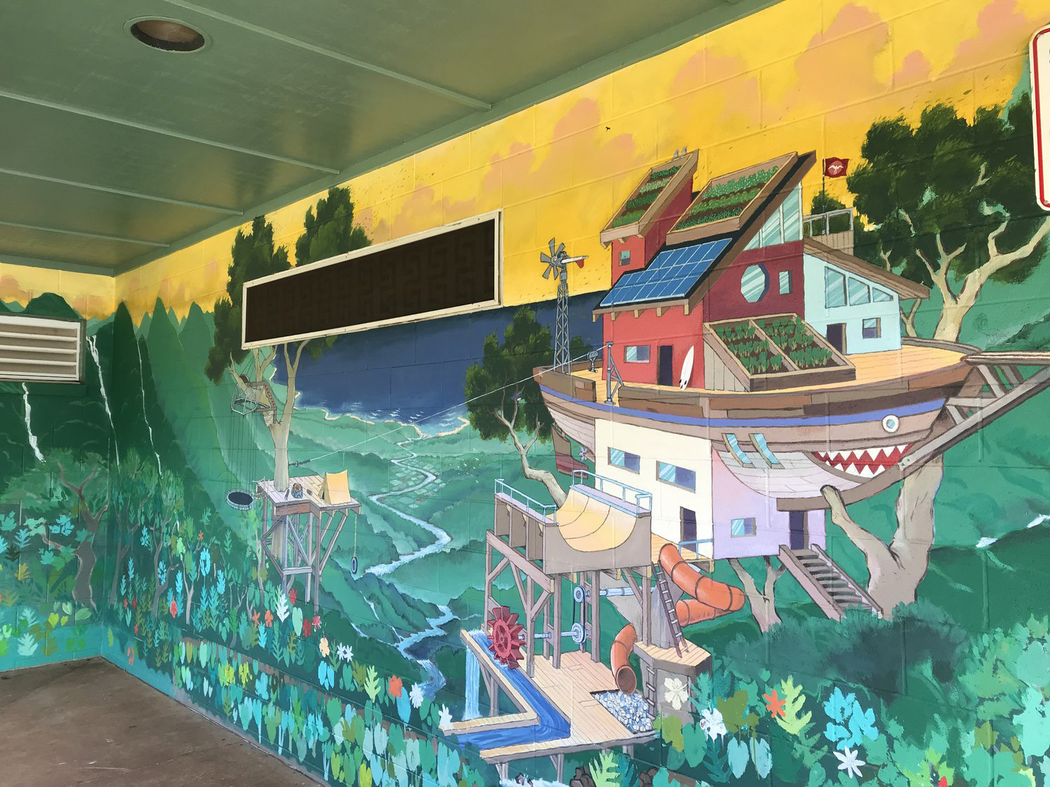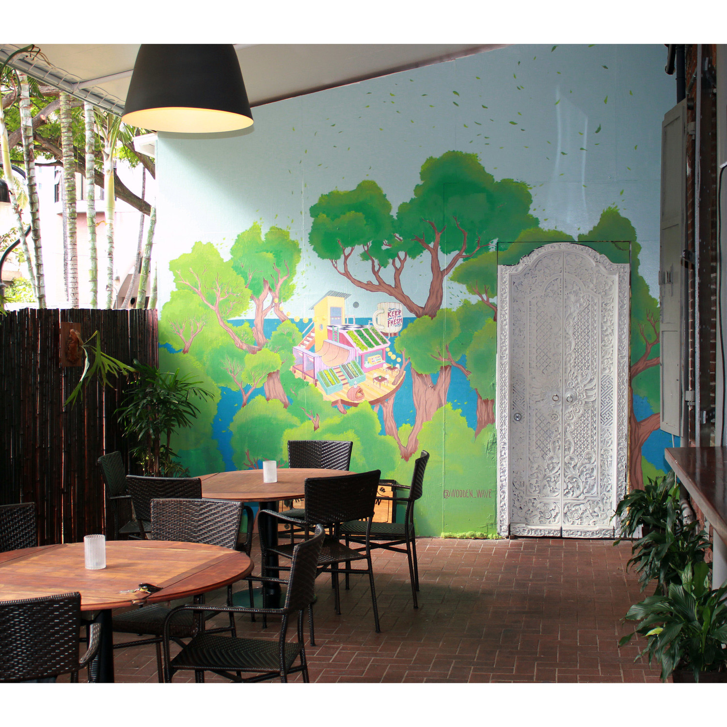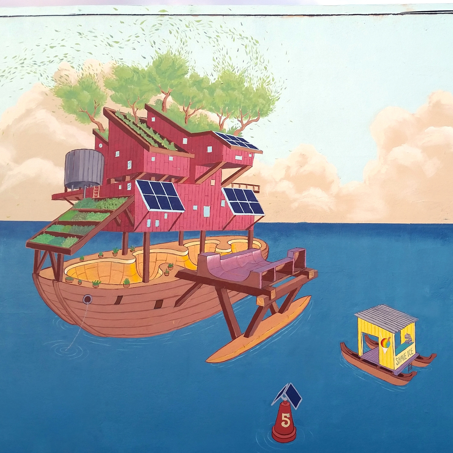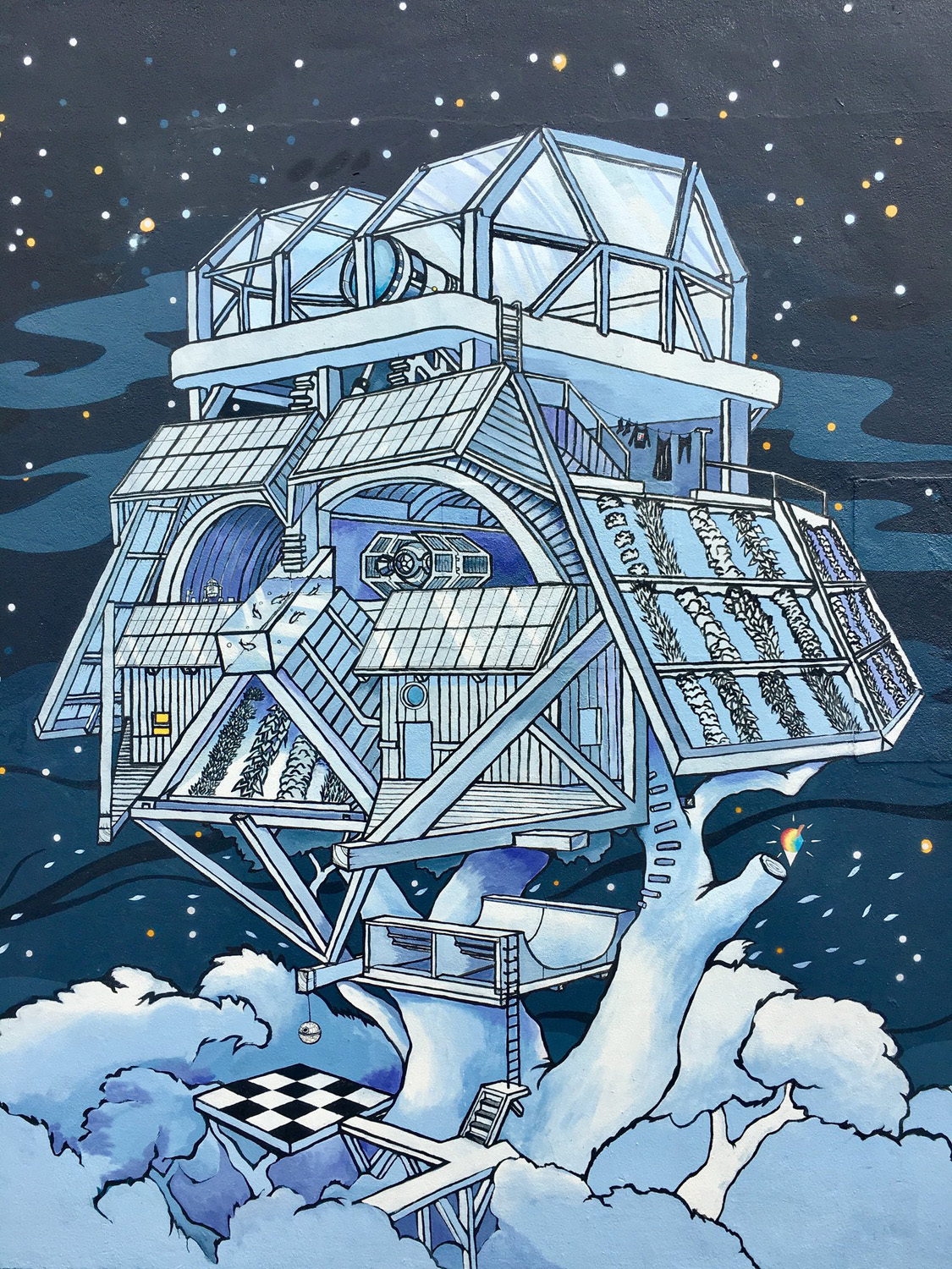 Born and raised in Hawaiʻi, Matthew and Roxanne Ortiz are a husband and wife art duo who collaborate under the name Wooden Wave. Their work has a hand-drawn aesthetic that reflects a playful sensibility and appreciation for draftsmanship. Frequently using treehouses as their subject matter, the art of Wooden Wave presents a whimsical take on the notion of the sustainably integrated community. The treehouse, as a symbol, exudes a nostalgic sense of possibility and represents the ultimate icon for adventure. But beyond the obvious romanticism of a dwelling built in the canopy, the inclusion of solar panels, water catchment, aquaponics, and green roof systems make each composition relevant to the environmental issues of today.