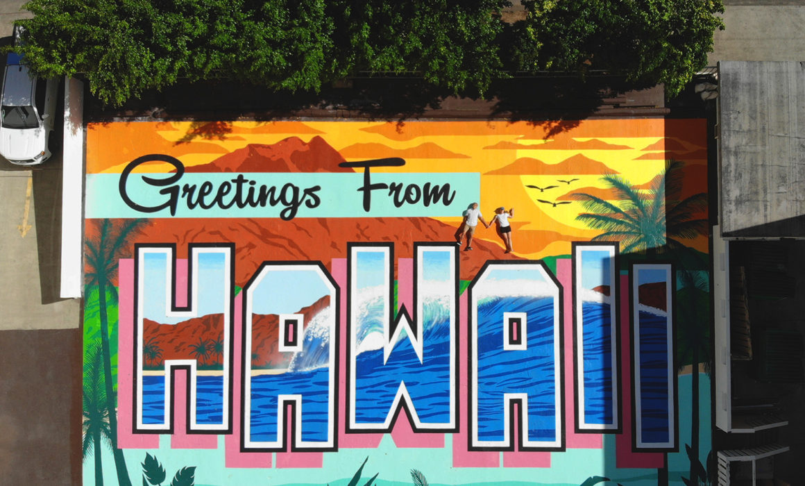 Aloha! We had the opportunity to partner with ‘Alohilani Resort in Waikiki Beach, Hawaii. We painted a huge mural on the ground meant to be viewed from a pool bar and high rise hotel rooms. For this project, the natural and perfect artist match was the Greetings Tour. We partnered with them to design and execute this enormous 50ft. x 75 ft. mural in paradise!