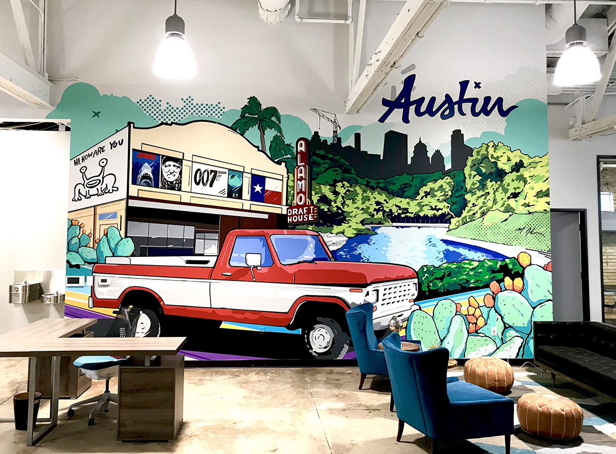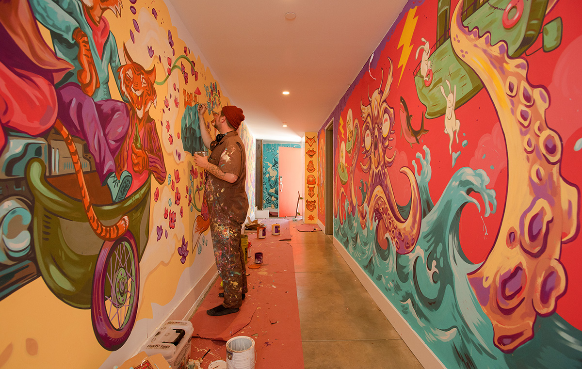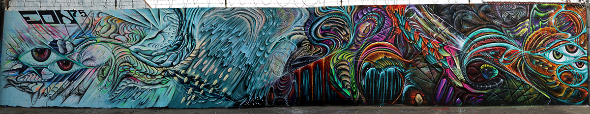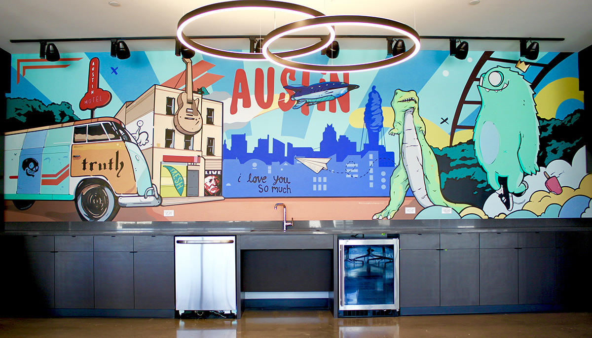 J Muzacz is a tenured professional muralist based in Austin, TX. Having developed a unique creative process in New Zealand after years of street art experimentation, his stained-glass style is an exciting new addition to the graffiti menagerie. With numerous murals to his credit in South Korea, Taiwan, Japan, Australia, New Zealand and the US, for notable clients including Chorus Communications (New Zealand), Transwestern (US), IDEA Schools (US), HOPE Campaign (International), Capital Metro (Texas) and Troublemaker Wine (US), Muzacz has proved his versatility and staying power as a relevant, contemporary public artist with the confidence to tackle big walls and budgets. Cutting-edge collaborations across culture and media show how muralism can inspire innovation and engage audiences in intriguing new ways. Site-specific original works of art complementing the existing architecture and environment involving spray paint, mosaic, sculpture and light have the capacity to communicate and engage the public in a fresh new way, ensuring maximum impact and a lasting impression.